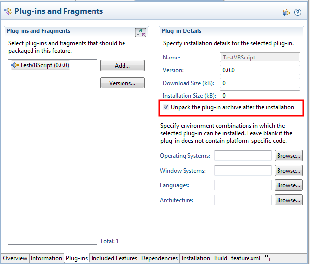 3. In dem Feature mittels dem dieses Plugin installiert wird, muss man die Option, dass das Plugin bei der Installation entpackt wird, anwählen. Sonst wird das vbscript in ein jar eingepackt und man kann es nicht ohne grössere Probleme aufrufen.