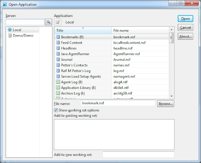 Übrigens im Designer wurde der selbe Dialog gegen einen neuen ausgetauscht, der nicht nur eine Windows 7 Fensterdekoration sondern auch die richtigen Knöpfe und auch ganz andere Icons für die Anwendungen und Ordner verwendet. Man muss aber sagen, dass auch diese Icons noch im 8.x Gewand sind und von der Farbe nicht zu Notes 9 passen :-( Wie viel Aufwand wäre es wohl gewesen diesen Dialog ohne Workingset Rubrik auch im Client zu verwenden.