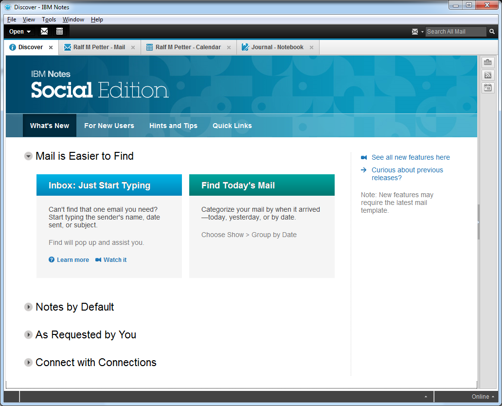 Endlich über die Weihnachtsfeiertage bin ich auch mal dazu gekommen mir die Beta von Notes 9 Social Edition im Detail anzusehen. Vorweg schicken möchte ich, dass ich Notes seit über 12 Jahren sowohl als Anwender als auch als Administrator und auch als Entwickler verwendet habe und auch nach wie vor verwende. Ich stehe Notes prinzipiell sehr positiv gegenüber und war auch immer ein Verfechter des Standardclients auch wenn die ersten Versionen des Standardclients sehr buggy waren. Ich war aber speziell ab der 8.5.1 der Meinung, dass Notes auf einen sehr guten Weg war. Die neuen Features wurden immer stabiler und auch die Performance wurde langsam besser. Als ich dann gehört habe, dass bei Notes 8.5.4 bzw. jetzt Notes 9 nocheinmal Verbesserungen am UI gemacht würden, war ich begeistert.